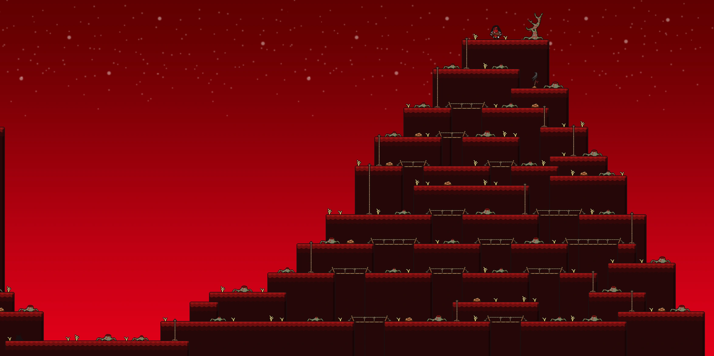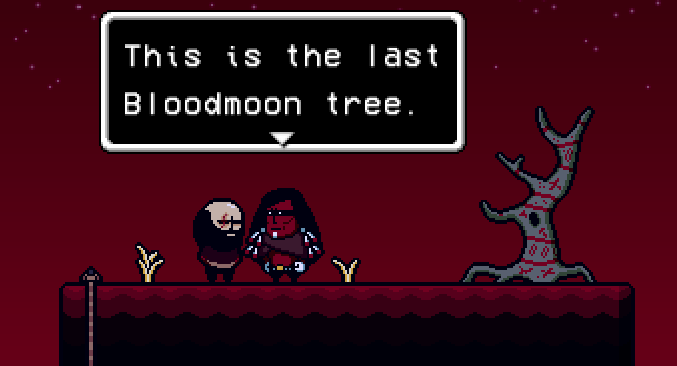 Bloodmoon Mountain, also known as the Blood Forest, is a sub-area in LISA: THE PAINFUL next to Area 3. The area is, as the name suggests, a mountain with a single blood tree on the top, with a dark red sky as a backdrop. It is populated by a number of the Bloodmoon Tribe, all of whom including the chief will fight Brad as he attempts to harvest the last blood tree for the boat.