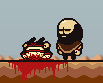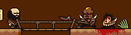 Inside of Brad's House, several dead-bodies can be seen; likely raiders who were killed by Richard, Sticky, and/or Cheeks while defending Buddy. A Rusty Knife can be found stuck in the bottom-right corpse, which can be equipped by a future party member. A few of Buddy's drawings can be seen in the cellar; a picture of the sky (according to the artbook, "the sky" is one of the things that Buddy likes), a picture of Buddy's "uncles" Richard, Sticky, and Cheeks, and a picture of Brad and Buddy together, described as "a happy family".