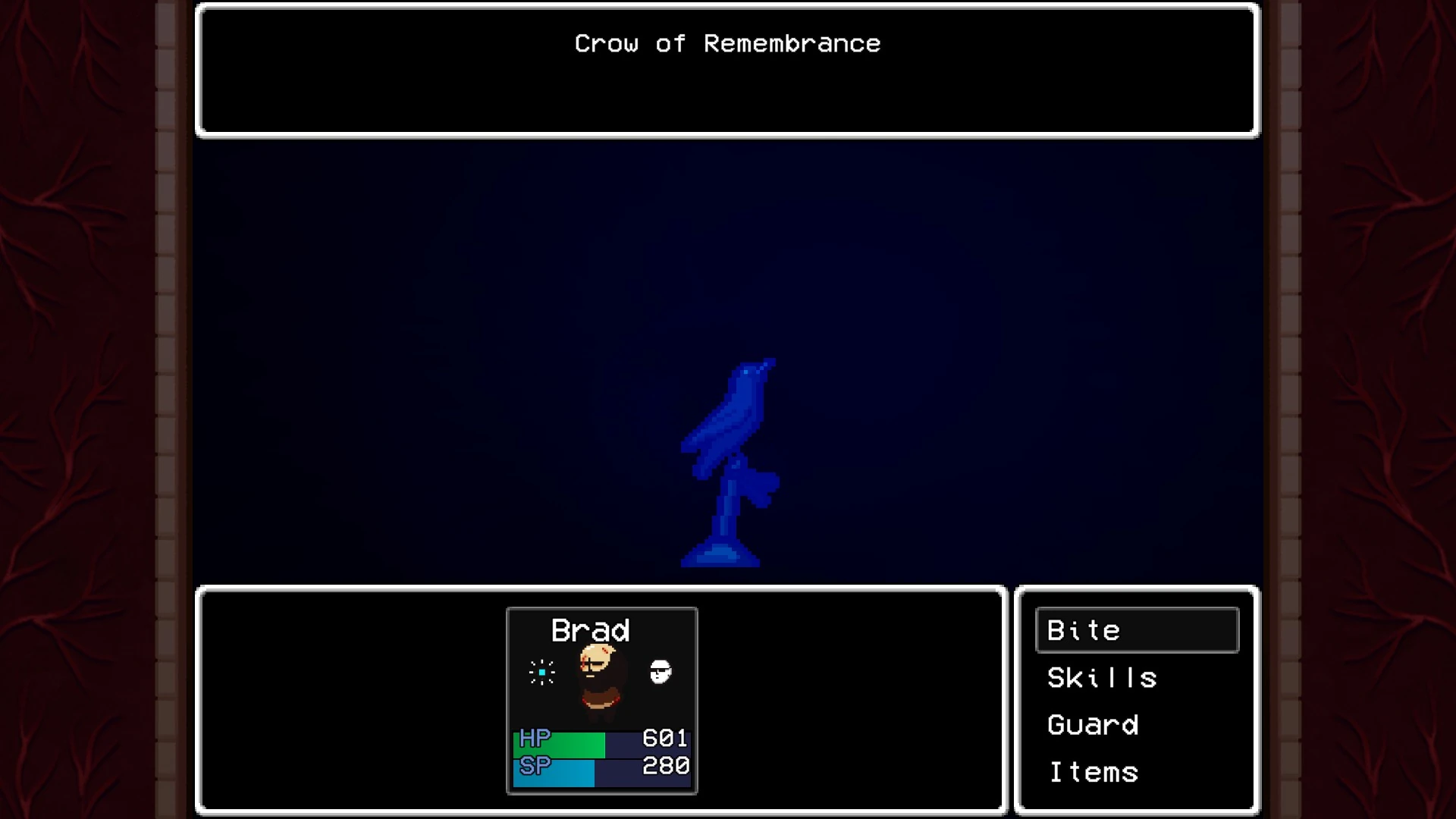 After coming down from the rope ladder, the very first cutscene of the game will replay, but this time, when the camera cuts in, Brad will be standing alone at night, on the playground. Walking to the left will lead to a Save Crow. However, trying to save at it will cause it to turn hostile, and start an encounter with the "Crow of Remembrance". Partway through this fight, the crow's head will turn into a deformed version of Buzzo's, and the enemy's name will change to "Bernard". For the remainder of the fight, Buzzo's head will animate by looking back and forth randomly and making short, singular laughs. Buzzo will spend the rest of the fight inflicting Brad with as many status ailments as possible until the end of the fight.