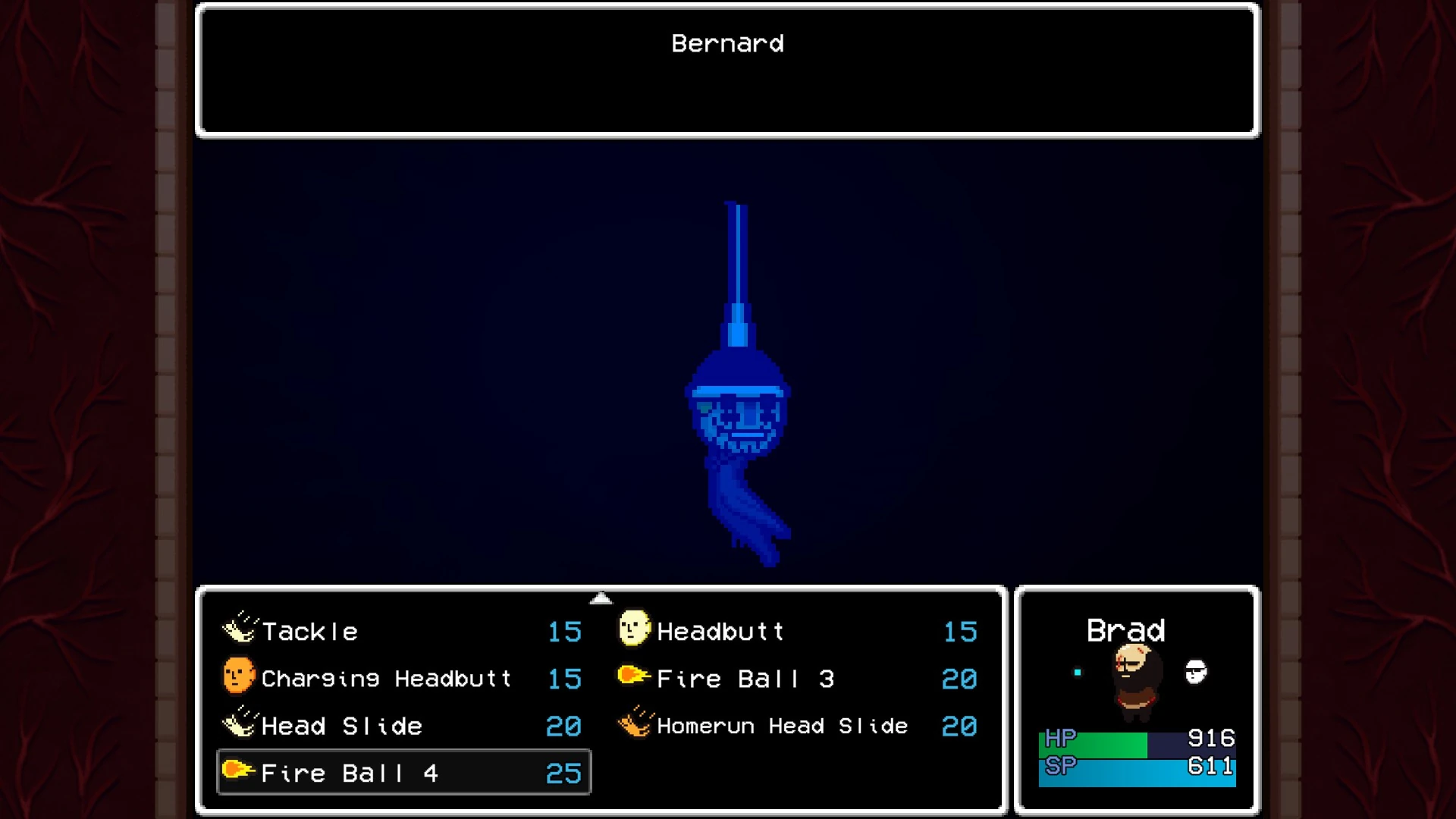 The Nightmare continues into a dark room with a floor made of blood, similar to the hallucination Brad has of Sticky earlier in the game. Upon reaching the center of this room, Marty's face becomes visible off in the distance, speaking to Brad. It is then revealed to be a part of an enormous fleshy mound, identical to an appearance he takes in Lisa the First. This leads into a long, arduous, multi-stage fight against Manifestation of Marty. Brad will call upon many Gang Members to help; not just the party he selects up front. This fight is extremely difficult, and can potentially take hours of your time if you are unfamiliar with the game's systems and how to utilize them to their fullest.