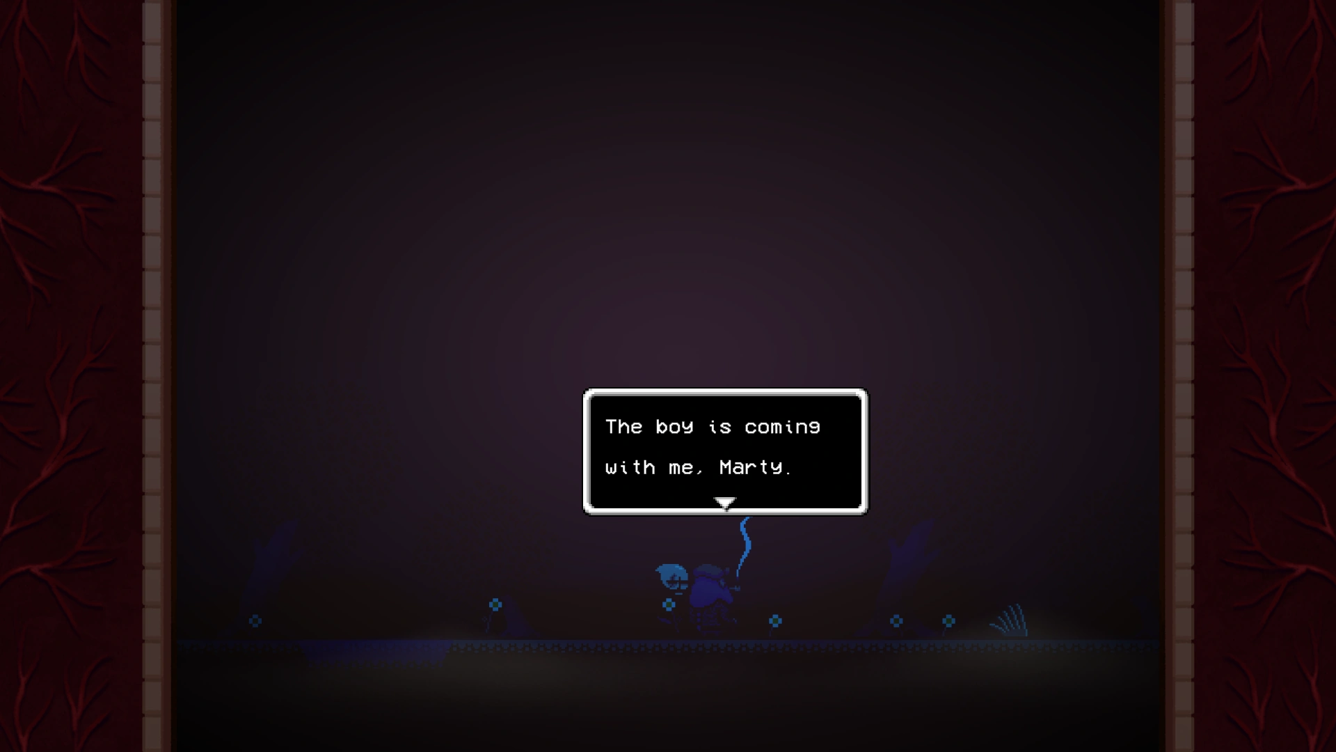Defeating this boss will lead to Brad waking up in front of the now blacked-out Marty mound, as a child. There will be a vein extending down below. He can interact with this to climb down it like a rope. A short poem will be heard while very slowly climbing down, until eventually reaching complete darkness. Here, a memory of a conversation between Brad and Lisa plays out.