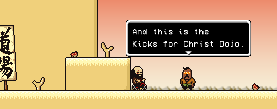 The third Dojo is found when entering Skull Town. It is run by Kanghis Christ. Drop down immediately to the left and you will find Dojo 3. In order to win, you must beat his cousin, Cousin Alfonso Christ. Upon defeating him, Brad will be gifted a Christ Style Scroll, and item that adds 8 max ATK and 8 max S.ATK.