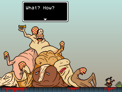 Buddy has killed all of the Warlords and has become the most powerful person in Olathe. An odd trumpet can be heard in the distance. To the west, this can be seen to be Dr. Yado, surprised that Buddy has not yet turned into a Joy Mutant. He continues to play his trumpet, ordering Sweetheart to attack.