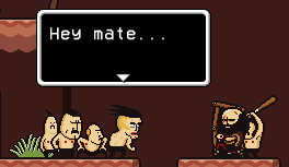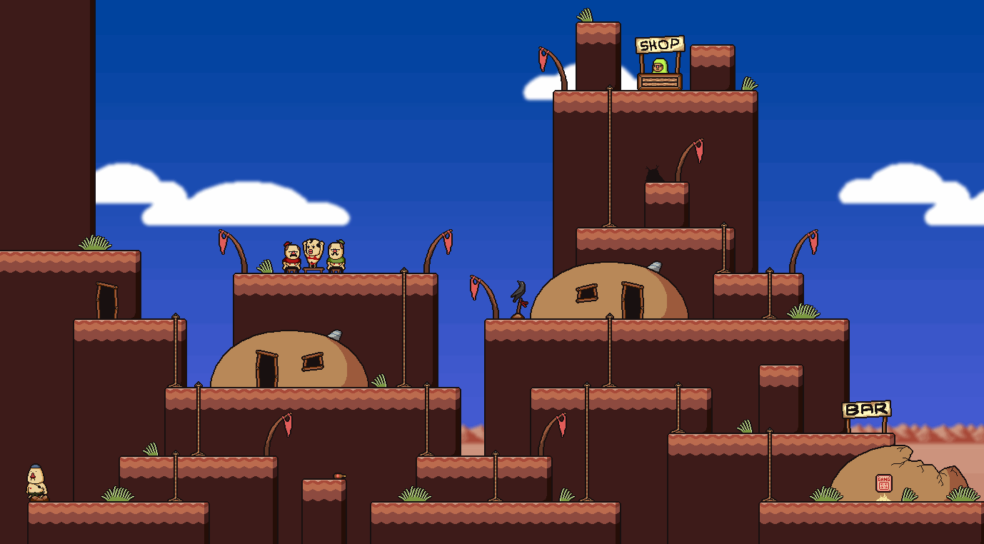 The Joy Factory town is presumably where the workers from the nearby factory used to live. To the bottom left is Mad Dog, who will join the party after you find his bat. The middle house contains a man who likes large butts because they cannot lie. In the middle is a Save Crow. In the middle building you will find a man looking for a bottle of water. If you got a bottle of water from the pump in Factory Road, you can trade it to him for 40 Mags.