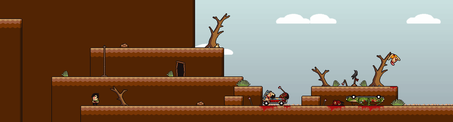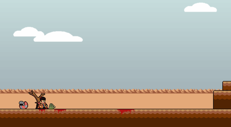 Upon emerging into the Path to the Beginning, Brad is greeted with the sight of several dead-bodies, who, upon closer inspection, are revealed to be the previously-seen members of the Sugar Boy Drifters. On the west side of the path, a mortally-wounded man can be found. Interacting with him will cause him to say; "holla-holla, if you hear me... really needed to get that off my chest.", before collapsing and succumbing to his wounds. Further up, a rope can be found, which leads to a bag of Domestic Jerky. On the east side of the path, a Save Point can be found, alongside a dead-body lodged into a tree. Moving further east will lead to Columbo's Road.