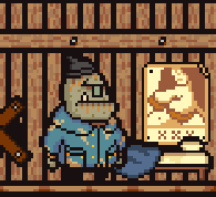 R.T is probably the weirdest looking out of all the party members, having a very orc-like appearance. he has sickly green skin and nose, with permanently closed eyes and two bottom teeth that goes beyond his lip. He wears a black beanie and a muddy blue coat that appears in his artwork, being held by two bandaids on his pockets and a red square stitch on his back, although the holes and bandaids are absent from his sprite in-game.