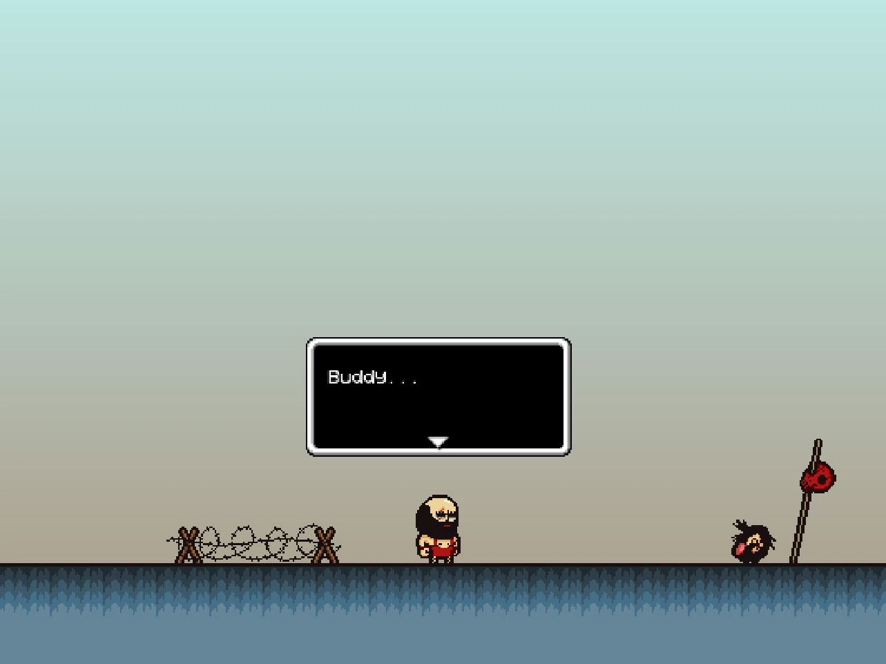 Brad finds Buddy next to the Rando Army. Brad attempts to flee with her, but she runs back into them. Behind Brad appear his three party members he abandoned. They try to reason with Brad that she is needed for the continuing of the human race. Brad denies that any of them need her, and that he is her one true saviour and that they are filling her head with nonsense. Brad fight his friends to the death. They participate, but fight half-heartedly. The music playing during this fight is 'The Sacrifice', the same music that is played when Brad is raising Buddy at the beginning of the game.