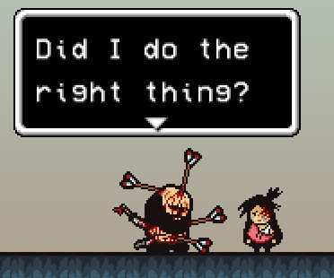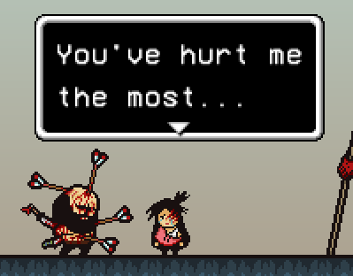 Brad seemingly becomes inhuman, learning the Cry skill. This will increase Brad's SP. Brad is losing all control of his rage and feeling that he is a complete failure(his battle sprite also has his head lean down). He fights other members of the Rando army who are slowly becoming more and more terrified of Brad, crying and weeping at what they are seeing: