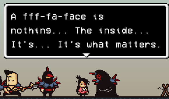 After Brad defeats his party members, Rando is seen comforting Buddy about her face, saying that "a face is nothing, the inside, it's what matters". He speaks in a very weak tone, to the surprise of his army as even they haven't heard him speak before.