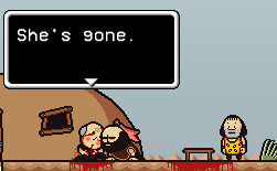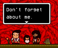 Just before the Area 3 Crossroads, Brad encounters Sticky, conscious but wounded. Brad, believing that Sticky molested Buddy, confronts him about it. Sticky mocks Brad for calling Buddy his daughter, and says he did what needed to be done to save the human race. As an aggravated Brad readies a Fireball to kill Sticky, a badly-injured Rick rushes in front of Sticky, attempting to shield him from Brad. Brad simply orders Rick to move, but he instead begs Brad not to hurt Sticky. Brad is then given a choice whether to spare Rick and Sticky, or kill both of them. If he chooses to spare them, Brad angrily tells them to leave and never show their faces again. Rick will thank Brad, but Sticky will instead tell him "This isn't over". If he chooses to kill them, the game will white out, and then return to Brad standing in front of Rick and Sticky's corpses, which have been obliterated from the top. If Brad interacts with the corpses, the game will note that there is "No going back now."