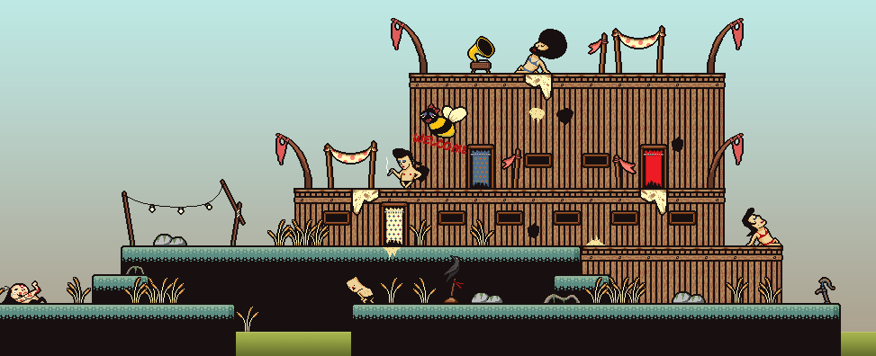 The Beehive is a brothel for men who miss women who disappeared in the White Flash and are so desperate for a "loving touch" that they will pay Queen Rogers male prostitutes/hookers/strippers (or as they're nicknamed in the game, Bees) to love and comfort them. While a majority of the Bees seem confident, they're shunned by most of Olathe's population and are confined to this area, protected by Queen Roger. Brad can become a Bee and earn tips for doing this. The Beehive can be accessed by the Area 2 Crossroads and then by walking east through Muddy Waters.