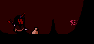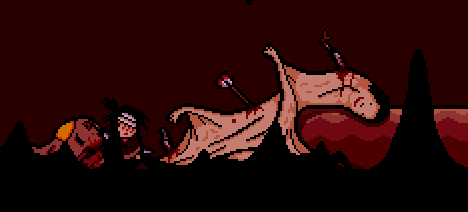 On the road to Vega Land, is a Joy Mutant, Bobo, around piles of mutilated bodies. Once the end of the cave is reached, Buddy can walk into the wall to the left to meet a Shadowy Figure and a bag of Domestic Jerky.